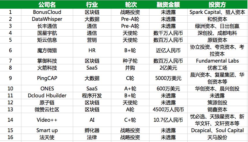 上周国内企服领域共发生16起融资,主要发在10个领域,其中区块链领域融资较多,共有4起、大数据、通信、SaaS领域也有较多融资,分别有2起融资。