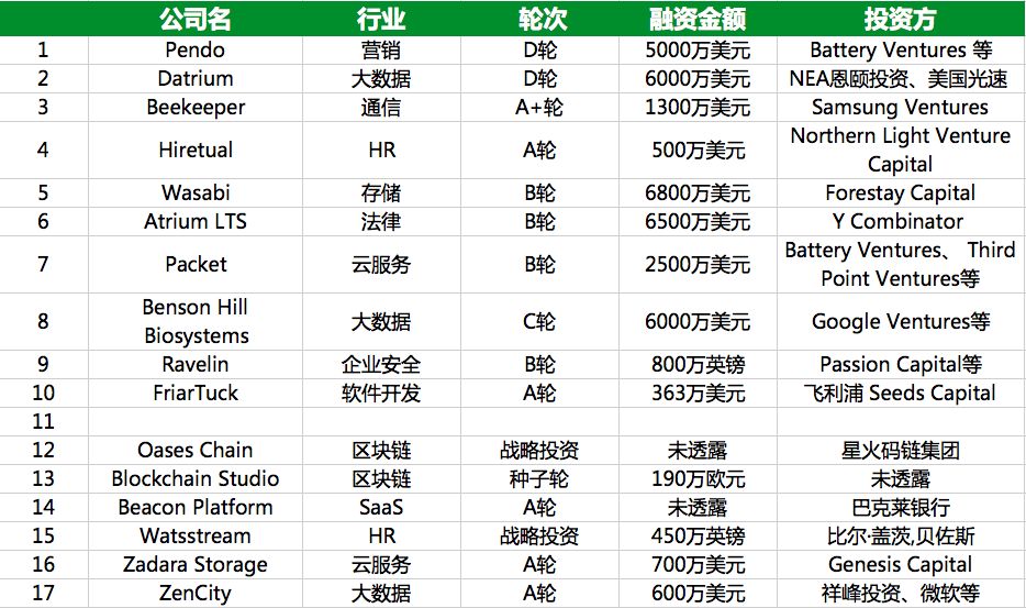 上周共收录国外企服领域17起融资,分散在营销、大数据、通信、HR、存储、法律、云服务、企业安全、软件开发、区块链、SaaS这11个领域。以下为国外企服领域融资汇总:
