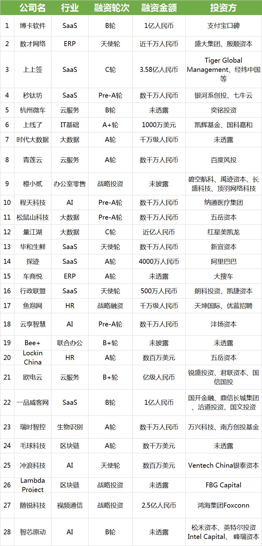 以下为国内企服领域融资汇总表