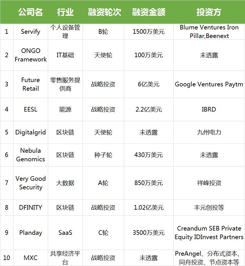 上周共收录国外企服领域10起融资,主要集中在8个领域,分别发生在个人设备管理、IT基础、区块链、大数据、能源、SaaS以及共享经济平台等领域。最高融资为Future Retail的战略投资,约6亿美元。