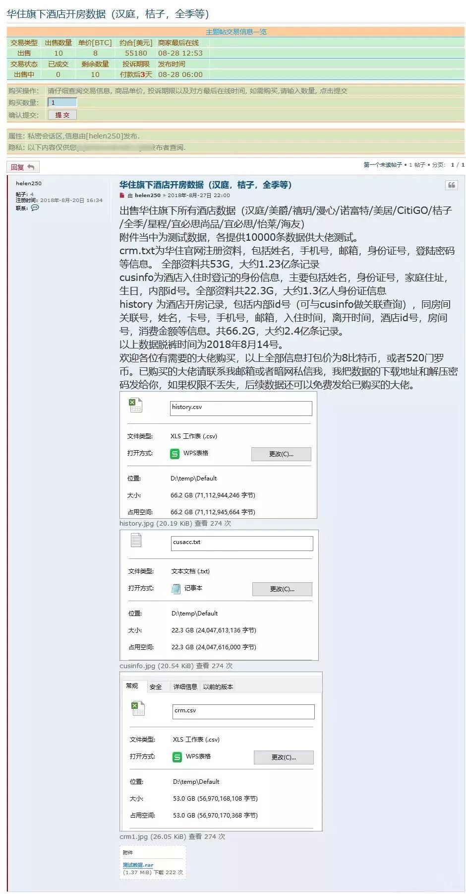 近日,暗网论坛中有人发帖公开出售华住旗下所有酒店的数据,包括汉庭、美爵、禧玥、漫心、诺富特、美居、CitiGo、桔子、全季、星程、宜必思、怡莱、海友等多家连锁酒店。