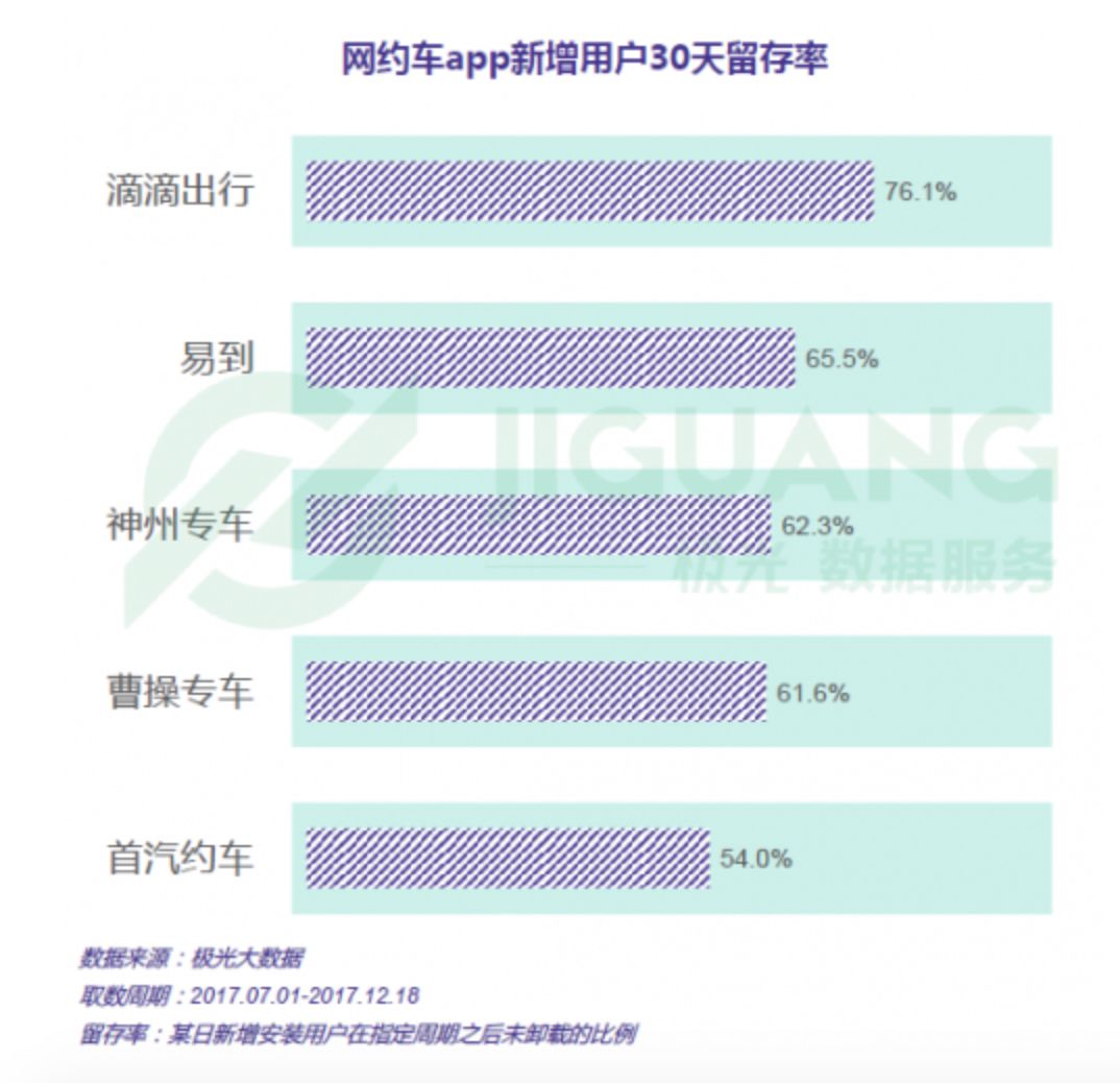 根据极光大数据的统计,截止2017年底,在各大网约车App用户30天留存率中,滴滴出行位居首位,高达76.1%。