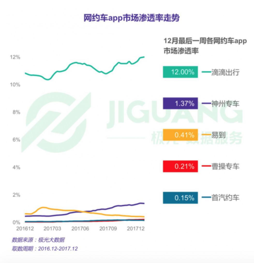 而在网约车市场渗透率方面,截止去年12月,滴滴也是以12%的市场渗透率遥遥领先,几乎是第二名神州专车的近10倍。