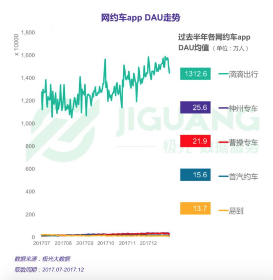 根据极光大数据的数据统计显示,截止去年底,滴滴平台的DAU(日活)用户均值超过1300万。也就是说,假设每个用户每天只有1单,每天滴滴平台上也有超过1300万单。