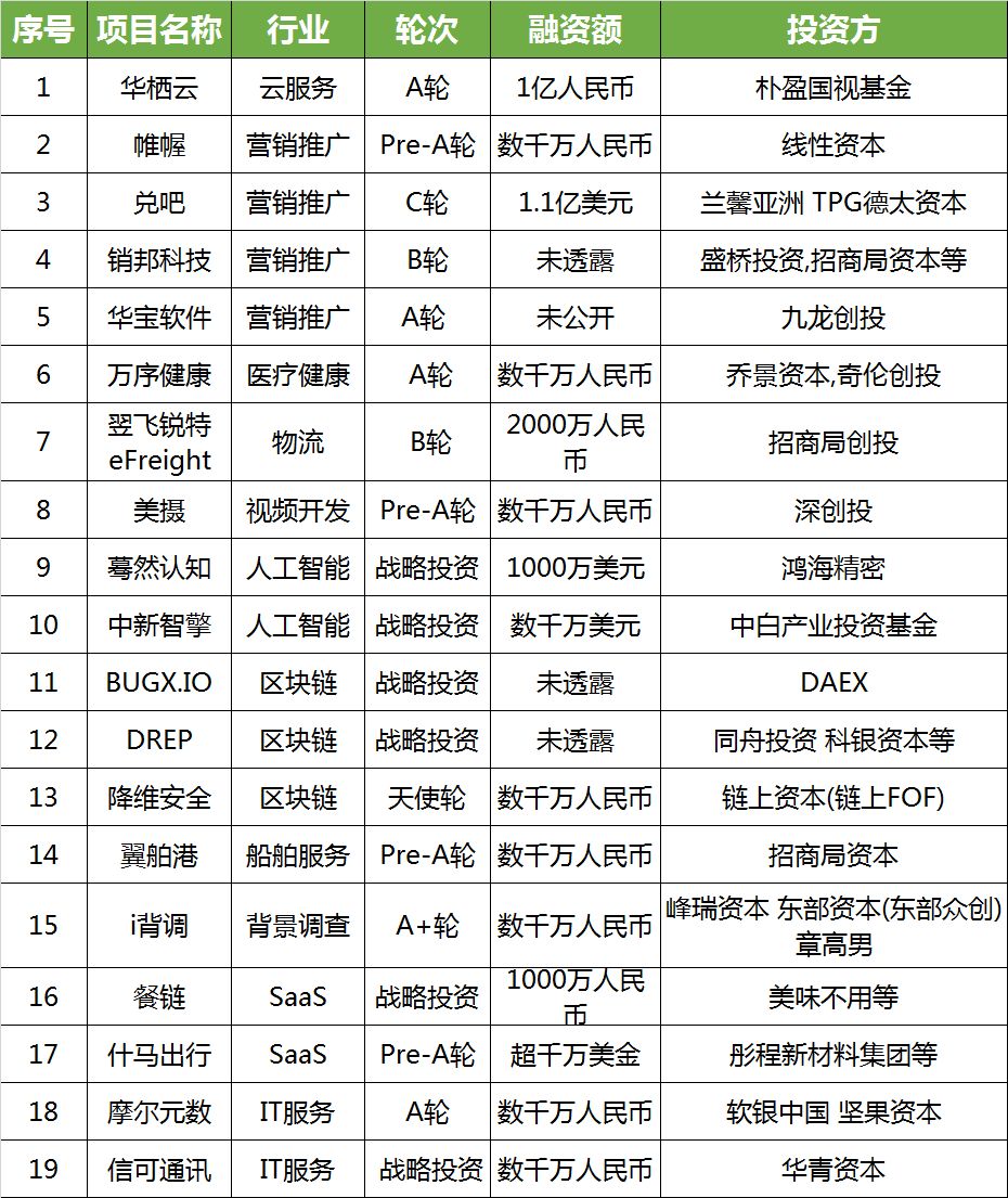 本周单笔融资额最高为兑吧的1.1亿美元的C轮融资,其余融资金额较为接近。