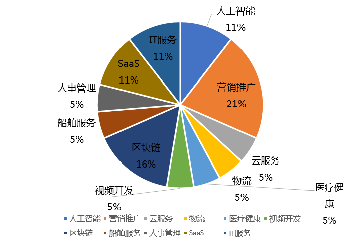 上周国内企服领域共发生19起融资,主要发在11个领域,其中营销推广领域融资最多,4起占比21%,代表企业有兑吧、帷幄等。其次为区块链领域的3起融资。