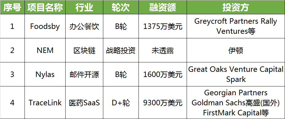 上周共收录国外企服领域4起融资,主要集中在4个领域,分别发生在办公餐饮、区块链、邮件开源、医药SaaS领域。最高融资为TraceLink的D+轮9300万美元。