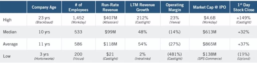 创始人,早期员工和投资者可能会看到他们的SaaS公司价格高于申请范围,以达到约6亿美元的市值,并且在他们的第一天交易后观股票暴涨率为32%。下表显示了这些业务的常规IPO数据范围。