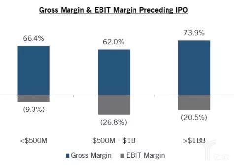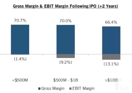 因此,随着时间的推移,首次公开募股的盈利基准已经下降。SaaS公司的毛利率滚动平均值收敛至约65%-70%,而息税前利润率则进入负值区域。