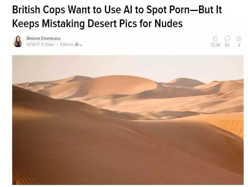 当年英国警察想用AI技术识别互联网上的色情内容,本以为AI出马,问题就能迎刃而解,可AI这个坑货却不怎么争气,总把沙漠的照片误认为是裸体。这每次鉴黄都给我找出来一张沙漠的图片,当真让人尴尬呢。