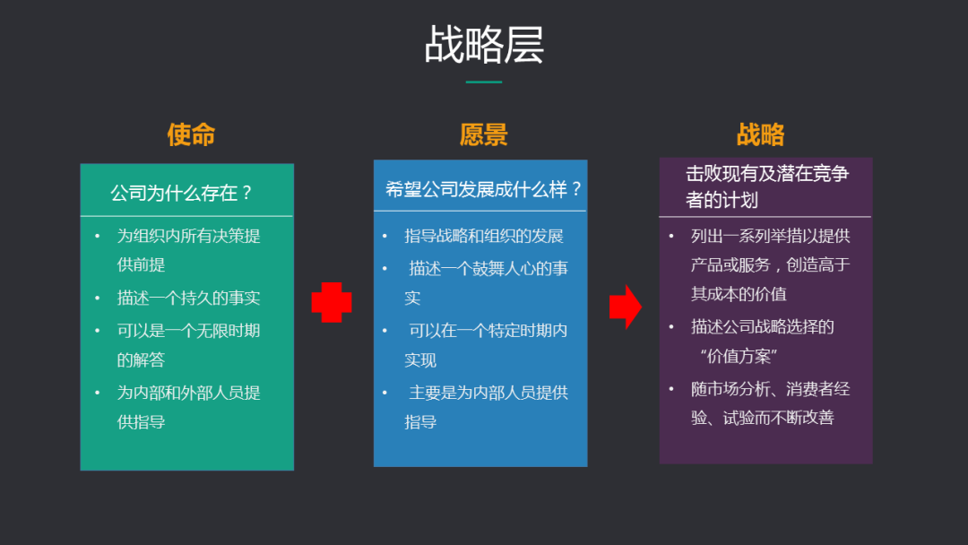 使命和愿景定义了企业存在的价值以及期望前进的方向,战略是基于使命和愿景的进一步落地计划。