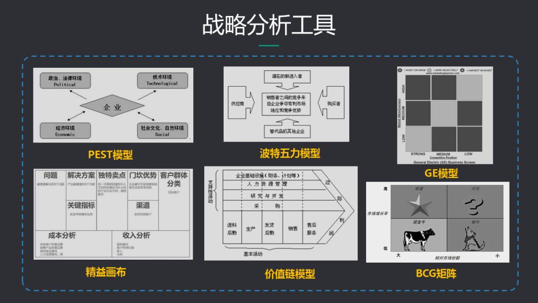 企业的战略分析有多套比较成熟知名的模型方法论,下图列举了常见的一些分析工具,产品经理需要理解这些工具的定义和使用方法。