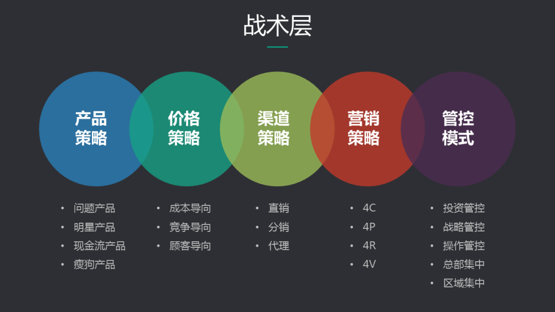 梳理完战略,接下来是具体承载战略落地的战术,这一层依然是比较高层次的经营指导方针和指导思想,具体包括了经营策略和管控模式,前者描述了要卖什么,怎么卖,后者描述了如何运作。