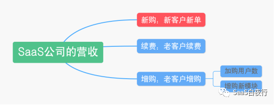 SaaS公司的营收来自三块:第1块是新客户的新购,第2块是老客户的续费,第3块是老客户的增购。