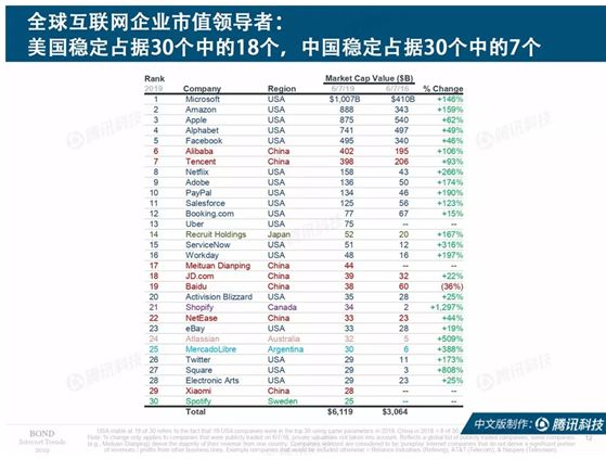 在互联网女皇玛丽·米克尔发布的2019年互联网趋势报告“全球互联网企业市值领导者”里,7家To B业务的公司Microsoft、Adobe、Salesforce、ServiceNow、Workday、Shopify、Square来自于北美,1家Atlassian来自澳大利亚,全球第二大互联网领导者中国无一家企业上榜。