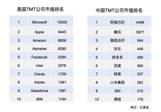 另外一方面,从中美市值最高的TMT公司看,美国有6家To B的公司,而中国无一上榜,差距非常明显。