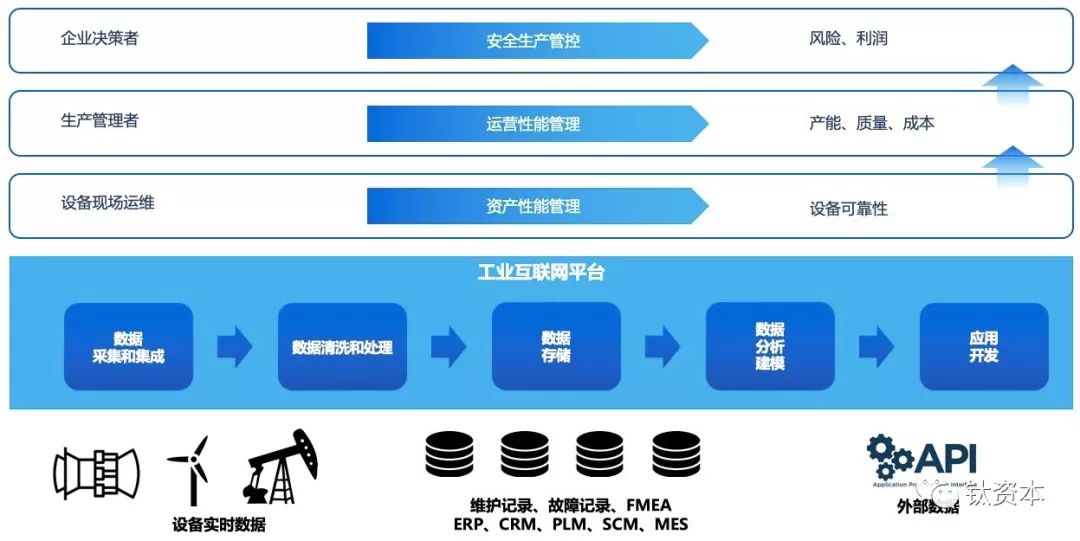资产性能管理系统主要涉及三方面:一是数据,即机器的实时数据、历史维护记录、失效记录、产品手册等;二是机理,像FMEA、控制理论等基本的工业模型;三是数据分析,变点检测、时序预测、聚类回归、机器学习、神经网络等结合在一起,才能产生一个相对完整的设备资产管理系统,实现实时监测、故障诊断预测、可靠性管理等一系列功能,最终目标是降低停机概率、降低运营风险、实现更快的响应能力。