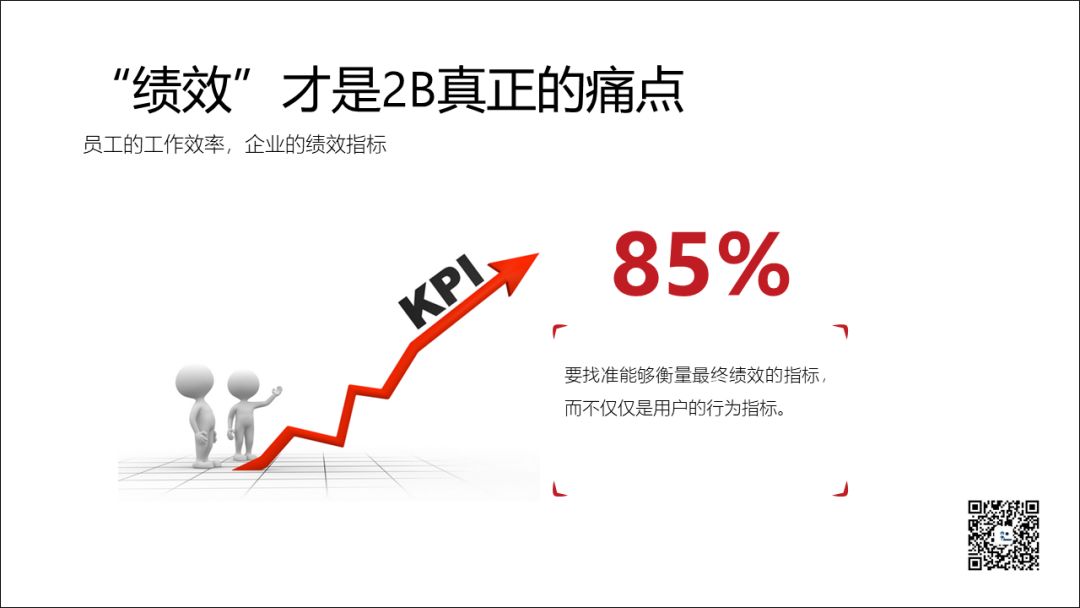 因此,2B产品的“客户”,他们的最关心的,一定是如何提升企业的绩效,2B的产品必须要要能找准衡量最终绩效的指标,而不仅仅是用户的行为指标。