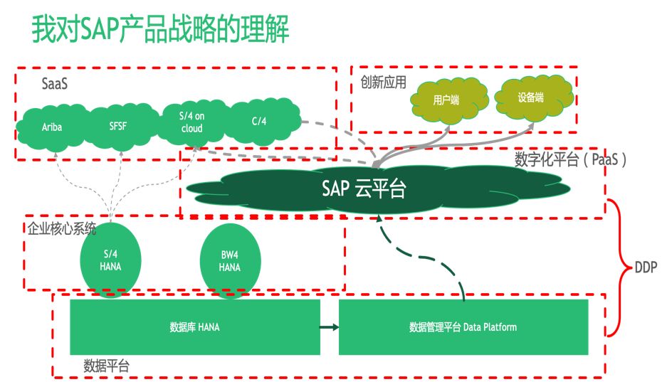 今天SAP的产品体系和20年前的SAP ERP相比,已经发生了翻天覆地的变化,顺应了企业信息技术应用从信息化到数字化的变革潮流,如果用数字化时代DDP架构来看今日之SAP产品体系,我认为分成主要五个部分(如下图):