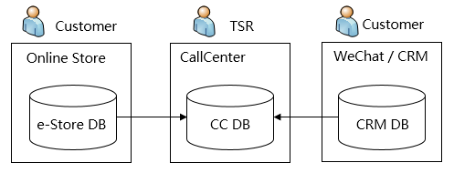 可以看到,随着业务的发展,公司出现了三套客户数据库,一套保存在CRM中,提供微信和CRM系统调用,一套保存在在线商城中,提供在线商城调用,第三套是前两套数据库的冗余合并,提供CallCenter调用。