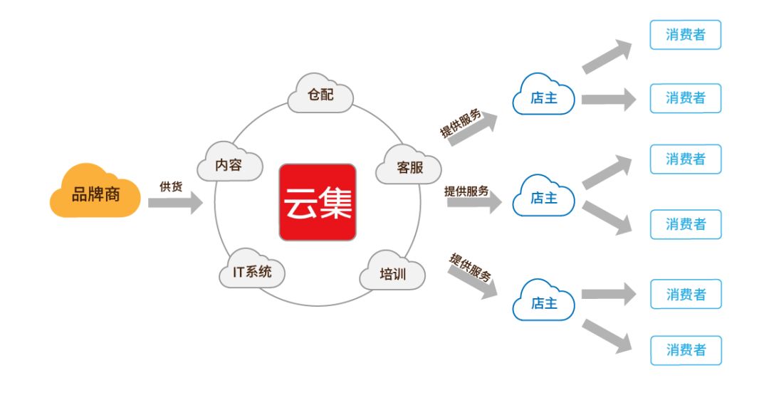 云集考虑的是将供应商数字化,通过控制商品供应链、物流、IT、客服等云资源开放给b,由b和消费者之间实现互动连接,b利用社交工具传播商品信息并进行售前、售后服务,借助个人信用,服务于C(消费者)。
