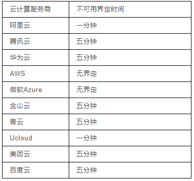 阿里云等三家服务商对云的“不可用性”给出了明确定义,具体内容如下: