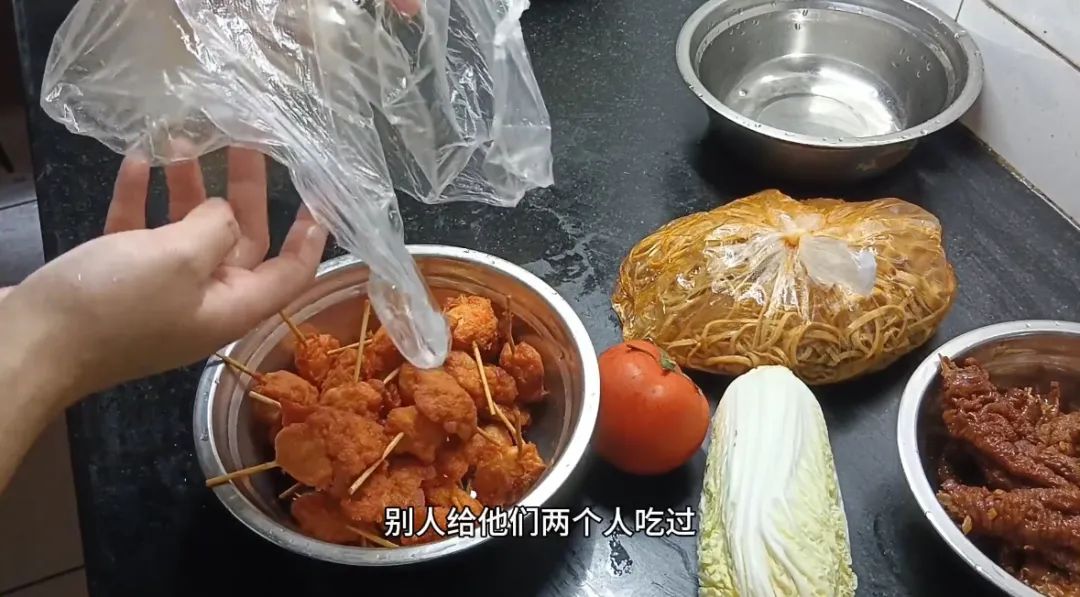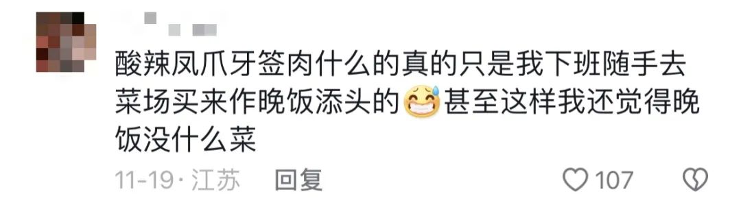 “酸辣凤爪牙签肉什么的,真的只是我下班随手去菜市场买来作晚饭添头的,甚至这样我还觉得晚饭没什么菜。”