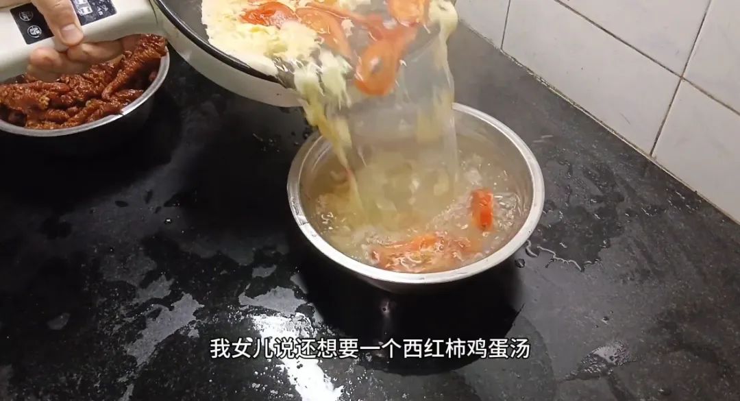 最后,为了营养均衡一点,宝妈还给女儿们做了一盆西红柿鸡蛋汤、一盘娃娃菜。