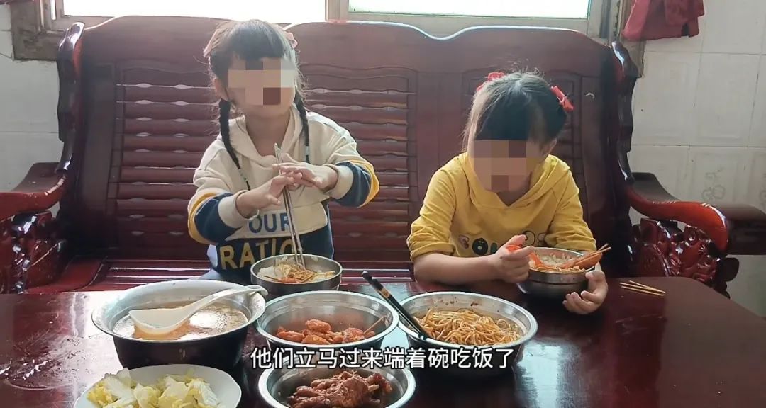 饭菜刚端上桌,两个女儿立马狼吞虎咽地开吃了,毕竟是平时很少能吃到的肉,吃起来很香。