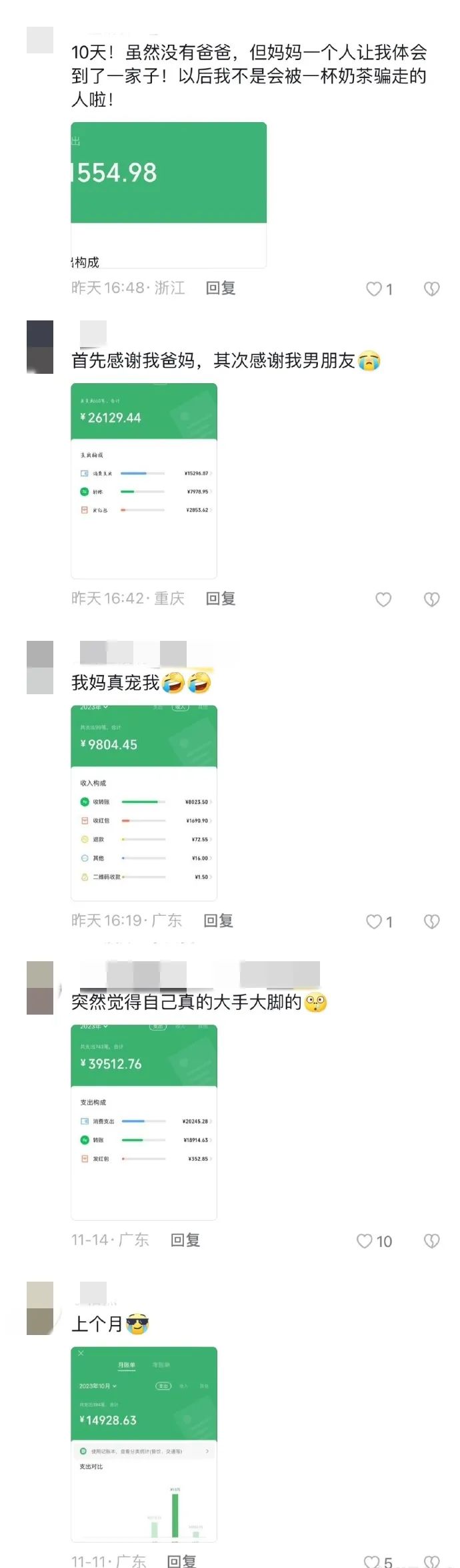 还有在评论区里齐刷刷地感谢自己的爸妈,并晒出自己几万块钱的月开支账单的: