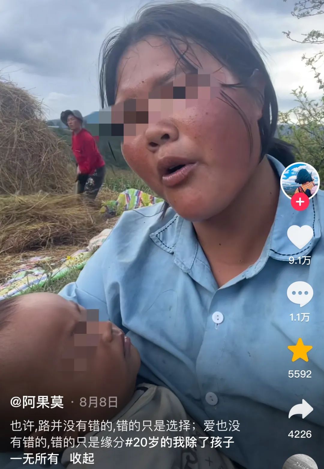今年才20岁的她,已然被劳苦的农活、心酸的带娃生活,折磨成了40岁的面相。