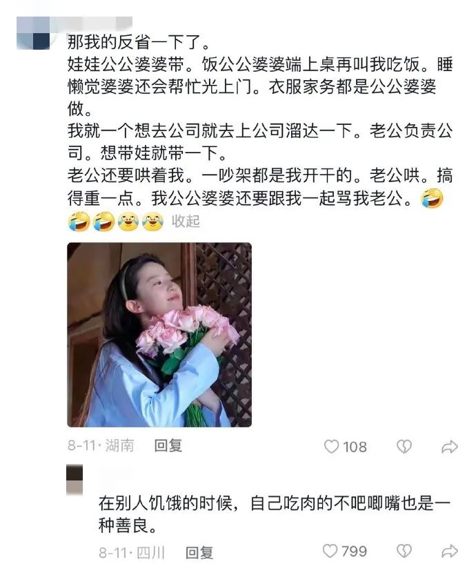 她发自己抱着娃的视频,底下就有一堆人在评论区里晒,自己老公和婆婆有多好;