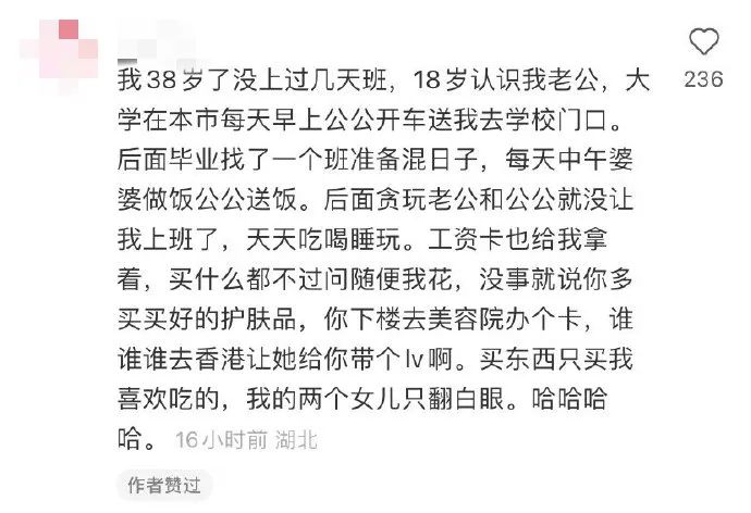 “我38岁了没上过几天班,天天吃喝睡玩,老公的工资卡也让我拿着,随便我花。”