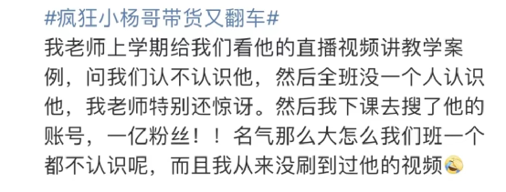 但有位大学生网友就说,老师上课提起小杨哥,他们班里竟然一个人都不认识。