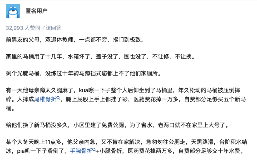 结果有次老太太蹲着脚一滑,整个人摔在马桶里,人摔成尾椎骨折,还被撞碎了的马桶割得全身是血。