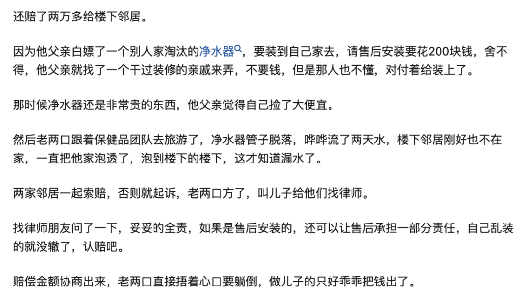 结果有几天两口子不在家,没接妥的管子脱落,活活漏了两天水,把楼下邻居家都泡透了。