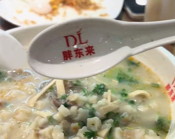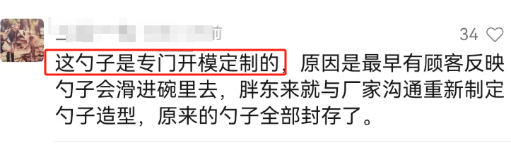 原来这是胖东来专门开模定制的,一开始有顾客反映勺子容易滑进碗里去,胖东来听劝了,跟厂家沟通了。