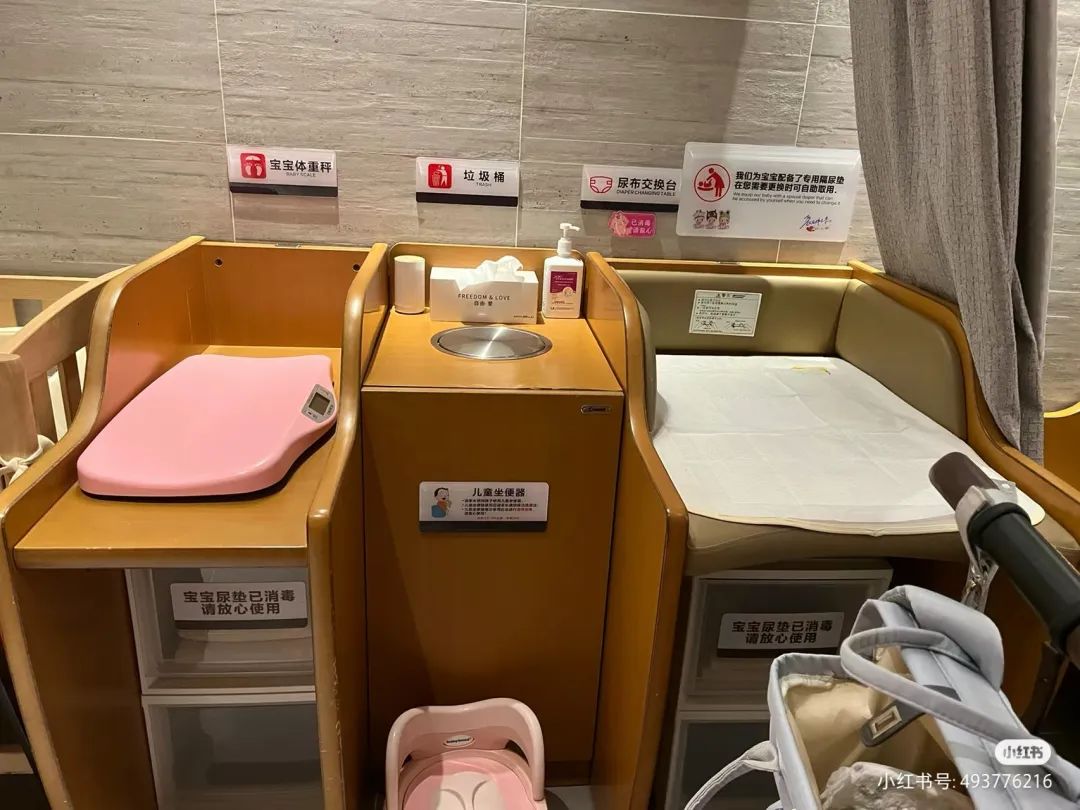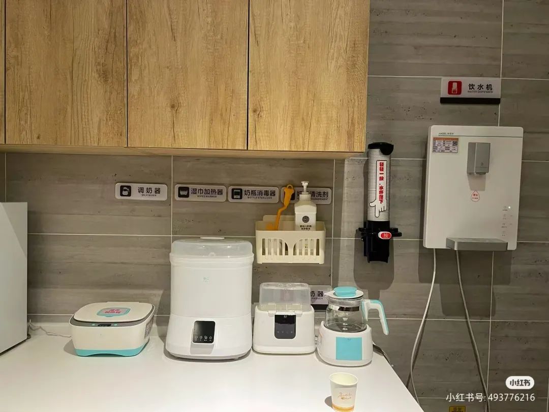 母婴室同样是天花板级别,恒温壶、小冰箱、风暖机、消毒柜、温奶器、小被褥、感应垃圾桶等,一站式配齐。