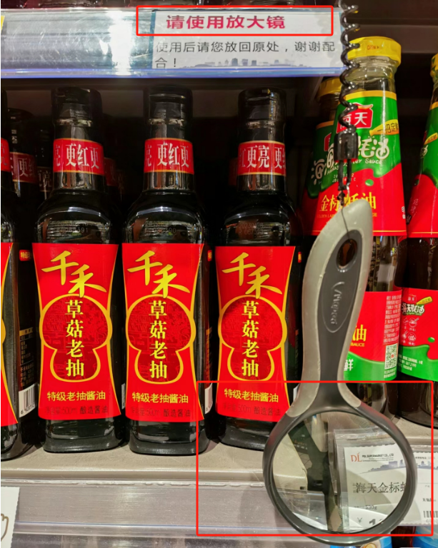 在调味品货架上,胖东来放了个放大镜,方便老人家查看配料表。