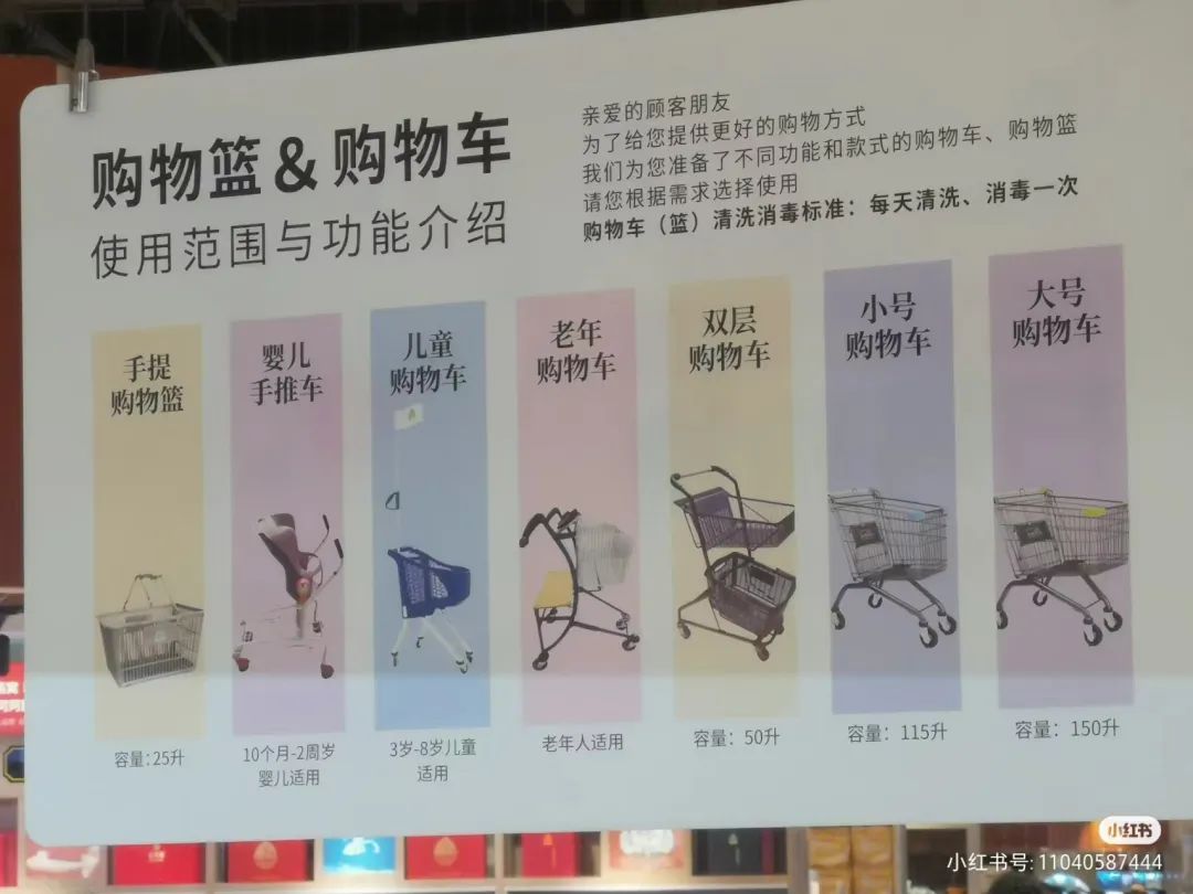 你敢想一家超市提供多达七种购物车——手提购物篮、儿童购物车、老人购物车等,甚至还在购物车旁边准备消毒湿纸巾。
