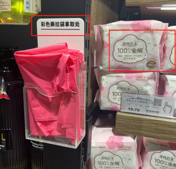 在姨妈巾货架上,给女性放着彩色撕拉袋。