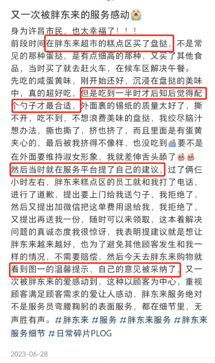 更值得一说的是,这个服务巧思居然还是胖东来聆听客户意见新增加的。