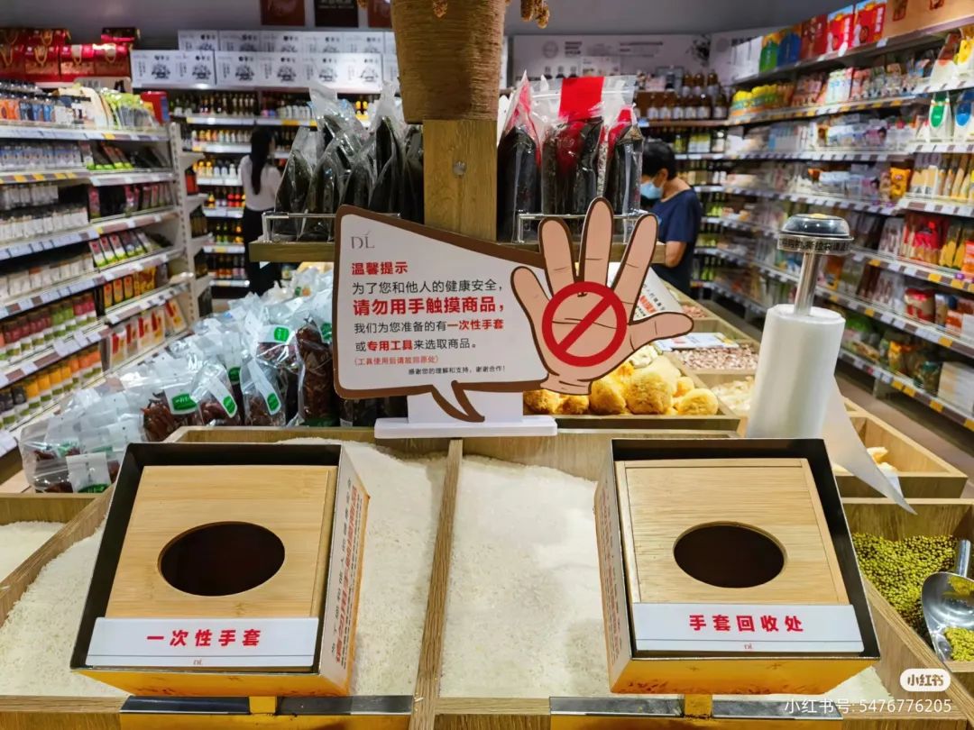 在散装粮食柜台提供一次性手套箱,避免顾客的手跟粮食亲密接触,只为把食安落实到位。