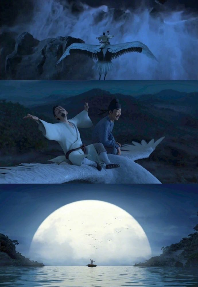 李白吟完“天生我材必有用,千金散尽还复来”,便引众人乘仙鹤上天。