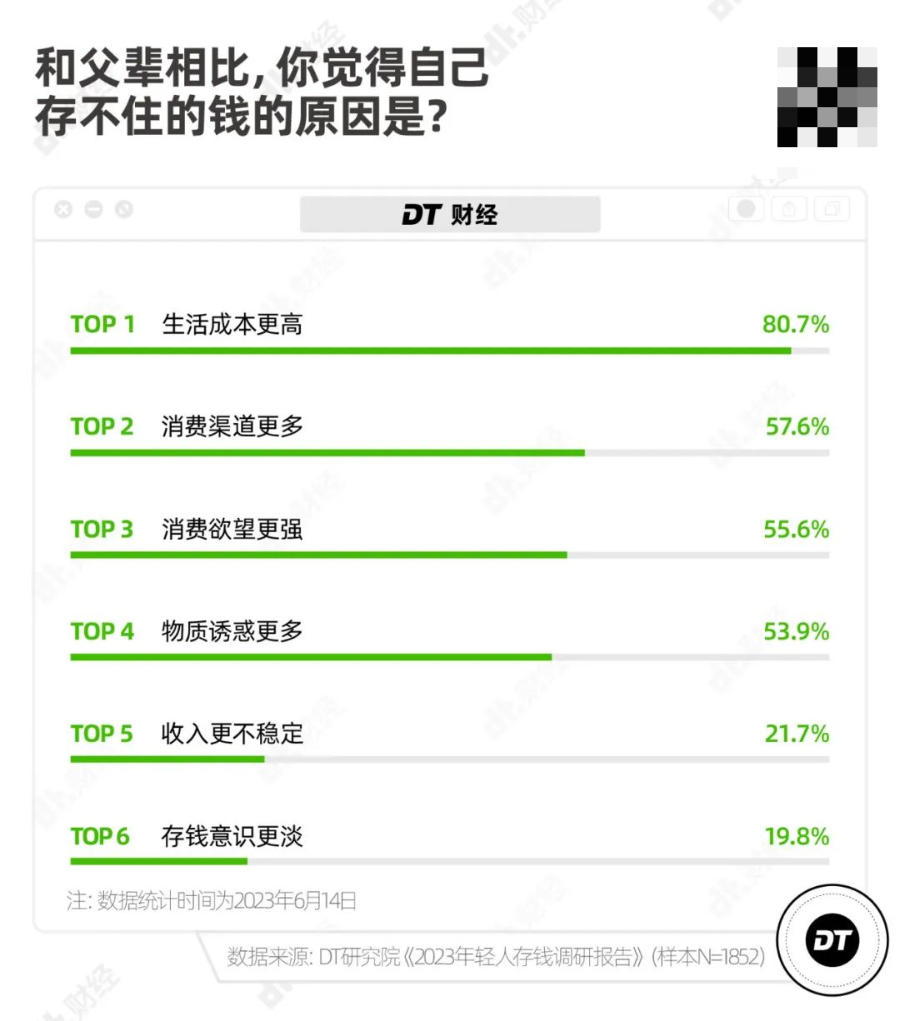 前段时间,“为什么父辈能存到钱”的话题上了热搜,DT财经针对这一问题进行了调研,结果显示,和父辈相比,年轻人存不下钱的原因还在于消费渠道更多和消费欲望更强。微博上广为流传的一张图这样解释“为什么父辈能存到钱,而我们不能”——我:星巴克、霸王茶姬、茶颜悦色、奈雪、喜茶、古茗、一点点、茶百道、蜜雪冰城……