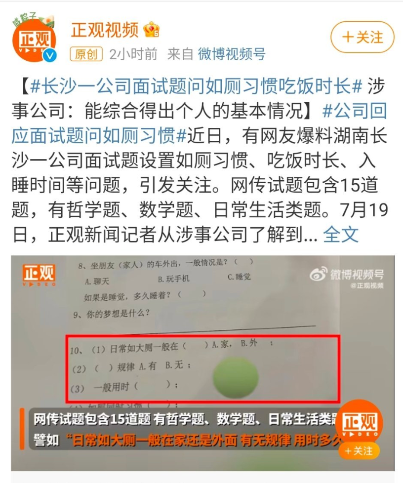 某公司面试题竟然要求回答如厕习惯、吃饭时长、入睡时间……