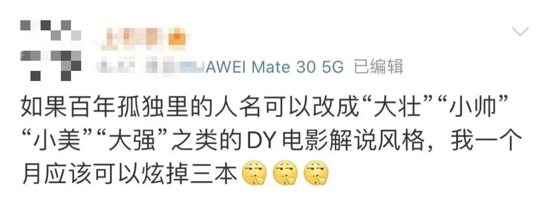 有网友感慨:“如果百年孤独里的人名可以改成大壮、小帅、小美、大强之类的短视频电影解说风格,我一个月应该可以炫掉三本。”