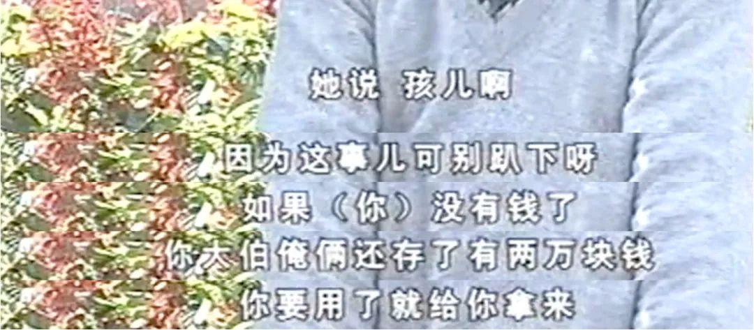 “孩儿啊,因为这事儿可别趴下,不要因为这一点事儿站不起来,要是没钱了,大娘和大伯还存了两万块钱,可以拿给你用。”