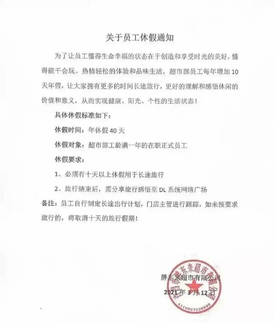 2021年,于东来决定将员工的带薪年假从30天延长为40天,并且要求其中10天必须要用于长途旅行,加上法定节假日与双休。