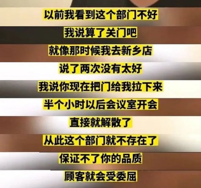 他立刻让负责人拉下门店的大门停止营业,半小时后他解散了整个部门,于东来说: